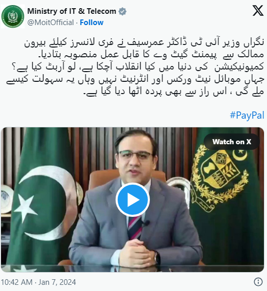اپنے ویڈیو بیان میں نگران وفاقی وزیر ڈاکٹر عمر سیف نے کہا کہ پاکستانی فری لانسر اب پے پال کے ذریعے پیسے وصول کرسکیں گے۔