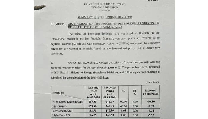 مٹی کے تیل کی قیمت میں 6 روپے 32 پیسے کی کمی جبکہ لائٹ اسپیڈ ڈیزل کی قیمت میں بھی 5 روپے 72 پیسے فی لیٹر کی کمی کی گئی ہے۔