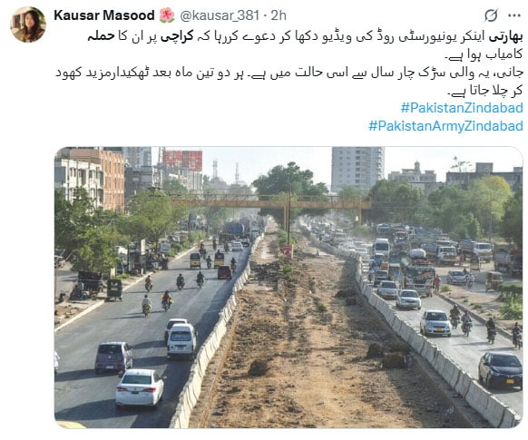 ایک خاتون صارف نے ایکس پر لکھا کہ ‘بھارتی اینکر یونیورسٹی روڈ کی ویڈیو دکھا کر دعوے کر رہا کہ کراچی پر ان کا حملہ کامیاب ہوا ہے۔جانی، یہ والی سڑک چار سال سے اسی حالت میں ہے۔ ہر دو تین ماہ بعد ٹھیکیدار مزید کھود کر چلا جاتا ہے’۔