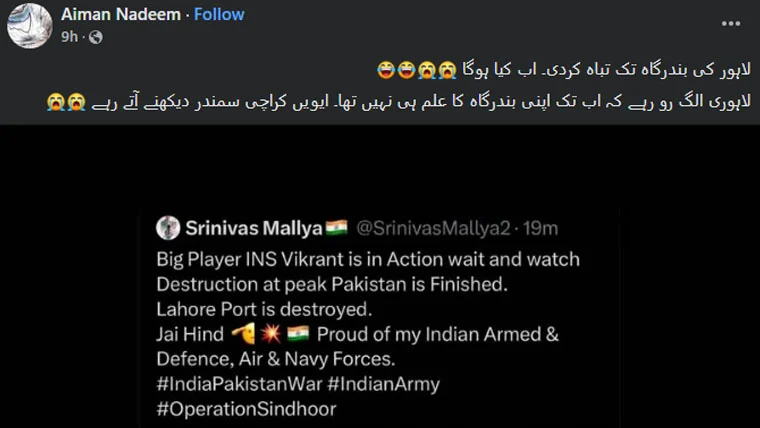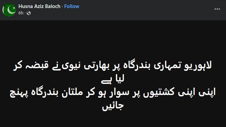 ایک صارف نے لکھا کہ لاہوریوں تمہاری بندرگاہ پر بھارتی نیوی نے قبضہ کرلیا ہے،اپنی اپنی کشتیوں پر سوار ہو کر ملتان بندرگاہ پہنچ جائیں۔