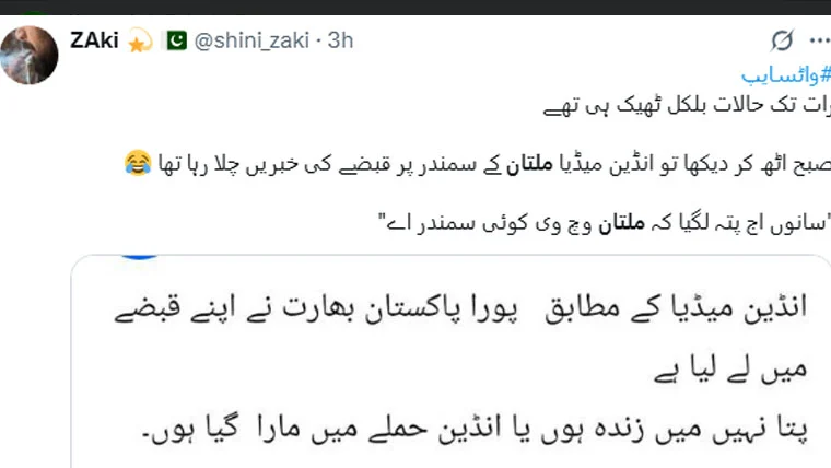ایکس پر ایک صارف نے لکھا کہ ‘رات تک حالات بالکل ٹھیک ہی تھے،صبح اٹھ کر دیکھا تو انڈین میڈیا ملتان کے سمندر پر قبضے کی خبریں چلا رہا تھا، ہمیں آج پتہ چلا کہ ملتان میں کوئی سمندر بھی ہے’۔
