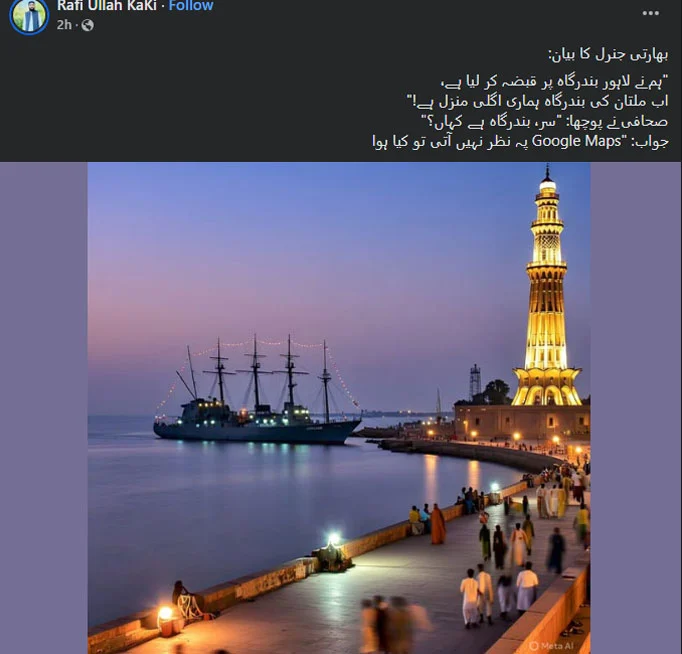 ایک اور صارف نے اے آئی سے بنائی گئی لاہور کی خیالی بندرگاہ کی تصویر شہیر کی جس میں مینار پاکستان بھی نظر آرہا ہے۔