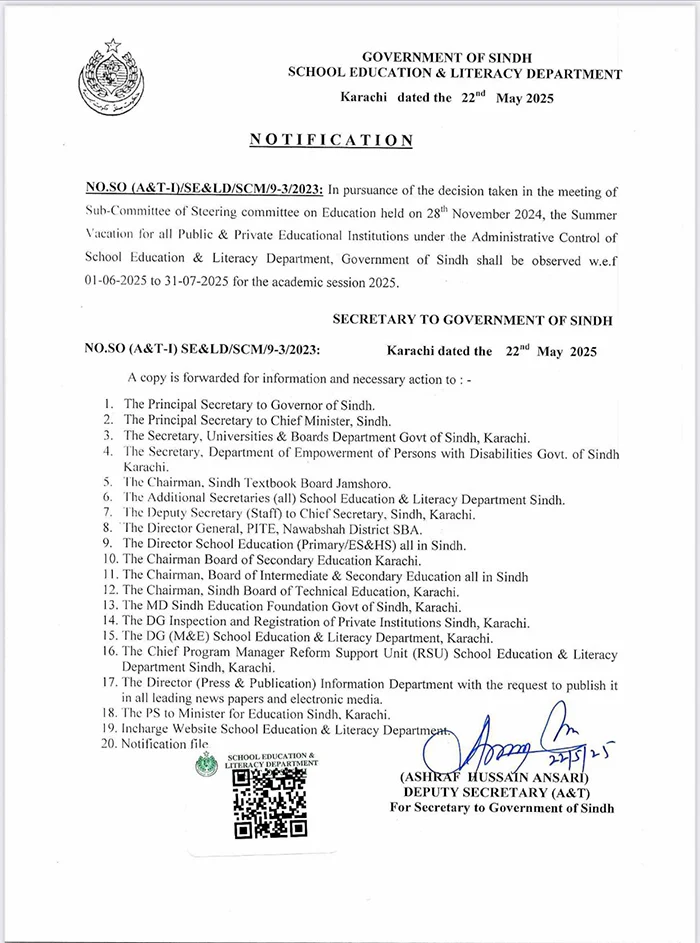 نوٹیفکیشن کے مطابق سندھ کے اسکولوں میں یکم جون 2025 سے 31 جولائی 2025 تک موسم گرما کی تعطیلات ہوں گی۔